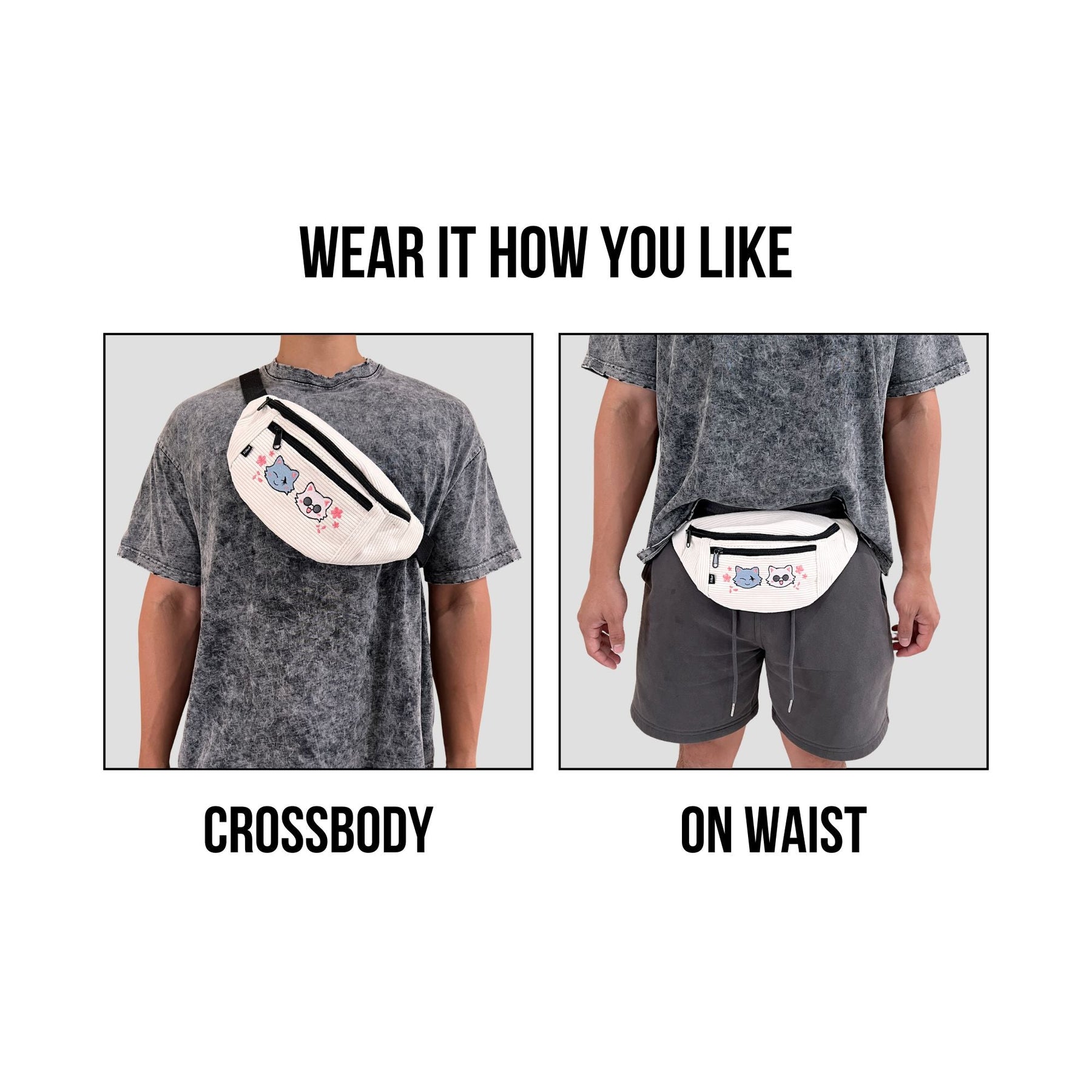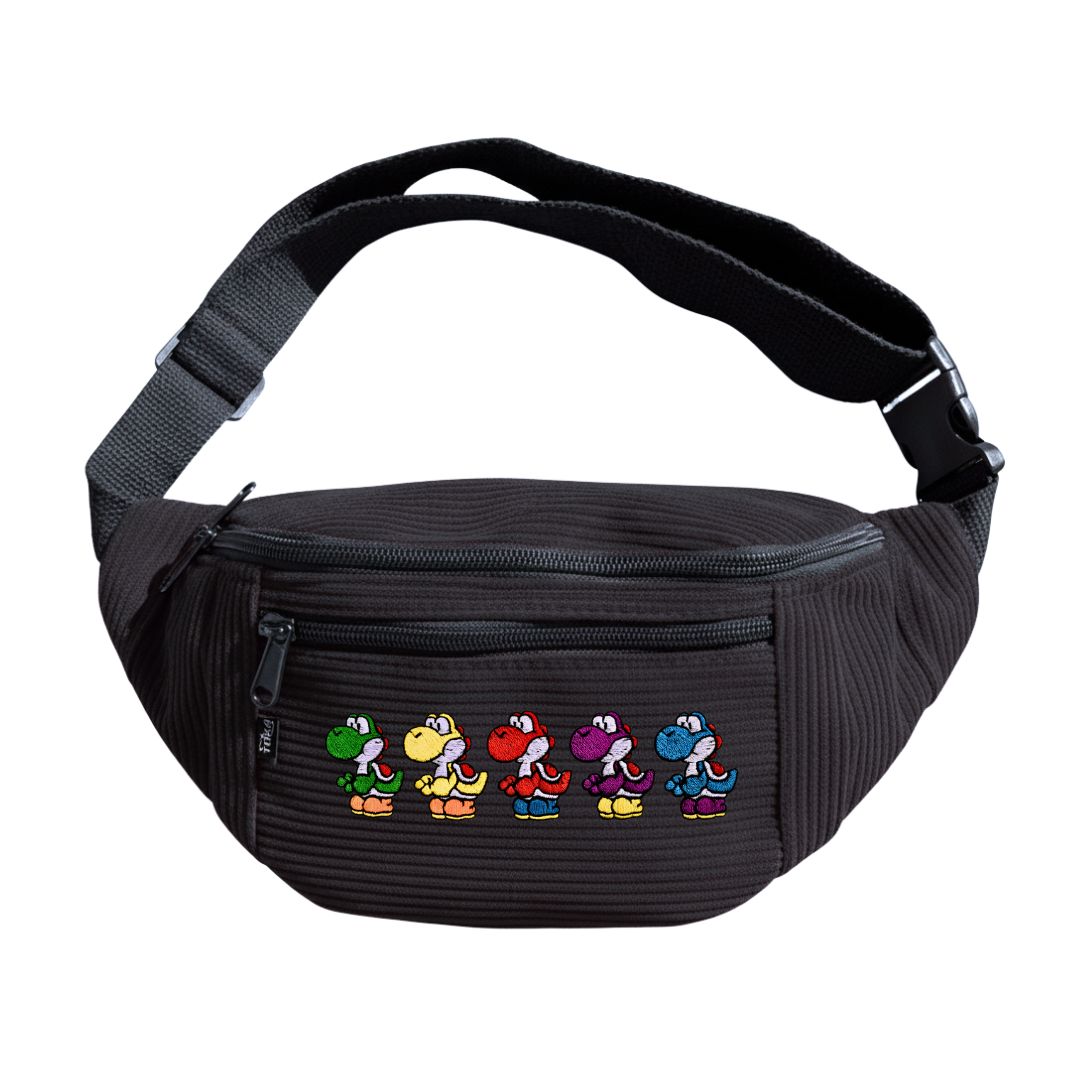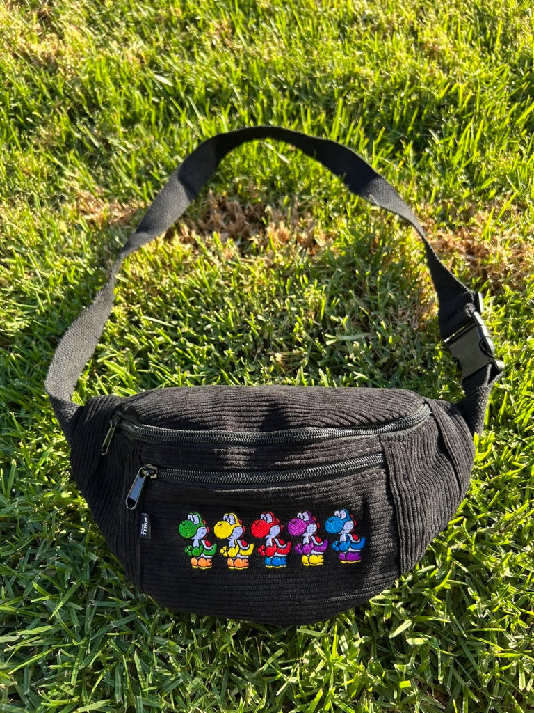 Our bum bag showcases a corduroy exterior and polyester lining interior. Featuring a more spacious main compartment and a smaller sub compartment pocket, this bag can be worn on the waist or crossbody. The front is accented with colorful embroidered character design, adding a playful touch of personality.